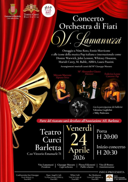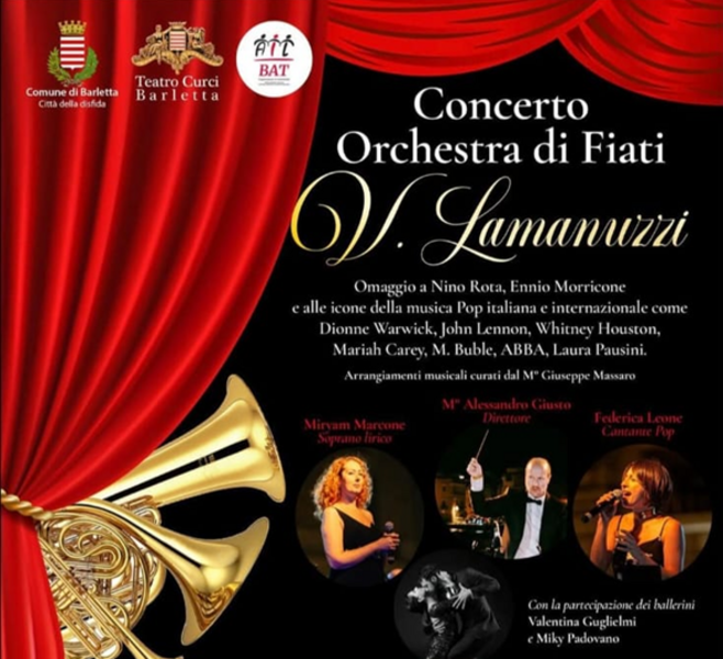 Si terrà oggi venerdì 24 aprile al Teatro "Curci" di Barletta un Concerto della Orchestra di Fiati "V. Lamanuzzi" presieduta da Vito Lamanuzzi e con protagonisti Giuseppe Massaro come Capo Orchestra, il Maestro Alessandro Giusto come Direttore, Miryam Marcone come Soprano lirico, Federica Leone come cantante con la partecipazione dei ballerini Valentina Guglielmi e Miky Padovano.