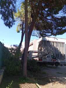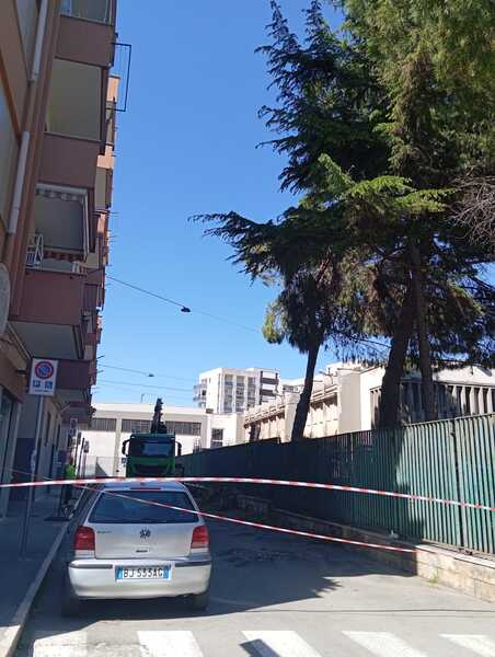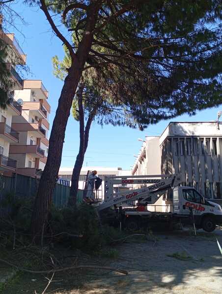 Prosegue senza sosta il taglio dei pini all'interno dell'area della scuola media Baldassarre: dopo l'abbattimento urgente degli alberi prospicienti e incrinati lungo via Istria, avvenuto nei giorni scorsi, l'operazione si è estesa questa mattina ai restanti esemplari della zona, evidentemente giudicati anch'essi a rischio schianto.