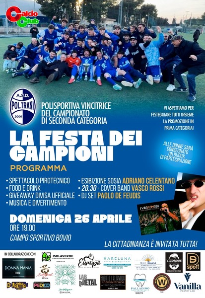 Per celebrare degnamente il traguardo raggiunto, la società ha organizzato per oggi, domenica 26 aprile, a partire dalle ore 19, una grande festa presso il campo Povia di via Imbriani. L'evento prevede musica, dj set, fuochi d'artificio e aree ristoro. Il momento centrale della serata sarà dedicato alla premiazione dei protagonisti della stagione: dirigenti, staff e calciatori sfileranno davanti ai propri sostenitori prima del concerto finale di una cover band di Vasco Rossi.