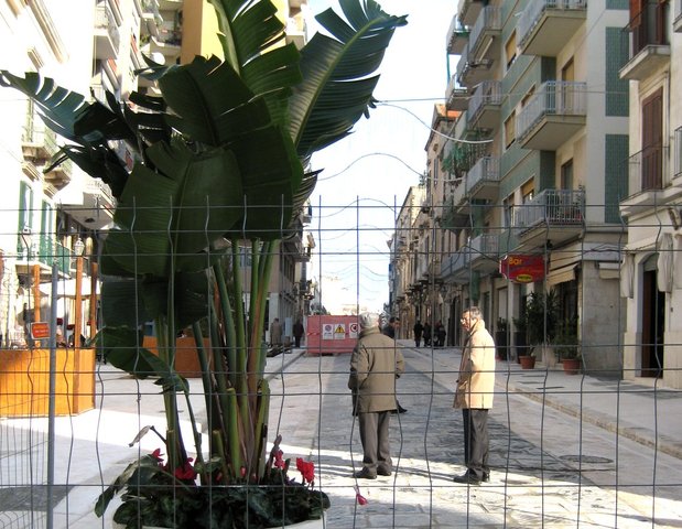 La direzione artistica del progetto è stata curata da un altro giovane talento dell’associazione, Andrea Moselli, che ha le idee molto chiare: “abbiamo realizzato dei chioschi in legno, che omaggiano il periodo ottocentesco in cui è nata Via S. Giorgio. Questo per creare un motivo artisticamente omogeneo alla vicina Piazza della Repubblica. Queste strutture fatte in legno sono un ottimo bigliettino da visita per quanti passano da Via S.Giorgio per giungere alla vista del Porto attraverso una strada in pietra di Trani che ha assunto con questo rifacimento una bellezza straordinaria. Inoltre questi chioschi in legno potranno essere successivamente utilizzati per altre iniziative, nella Villa comunale ad esempio. La loro eleganza ci permette di collocare nel resto della via momenti artistici, mostre fotografiche ed attività musicali, che renderanno questo passaggio pedonale, l’anticamera ideale per chi vuole raggiungere la camminata sul porto.”