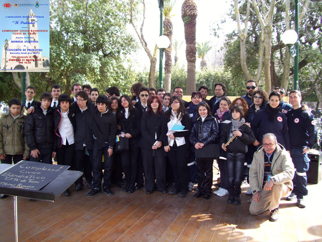 "Nella splendida cornice della villa comunale di Trani, utilizzando la storica “cassa armonica”, si svolto il “Concerto di Primavera”, organizzato dall’Associazione Musicale Culturale “Il Preludio” del Maestro Romolo Anastasia, in collaborazione con Unimpresa Bat e la Fidas, con il Patrocinio del comune di Trani.Si sono esibiti i 30 giovani musicisti che compongono il “Complesso Civico Bandistico Città di Trani”, egregiamente diretti dal Maestro Anastasia.