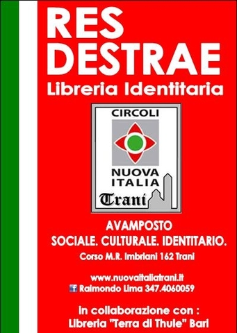 A Trani, presso il Circolo Nuova Italia di Corso Imbriani 162, nasce una Libreria Identitaria dove poter acquistare e consultare (sottoscrivendo la tessera socio) testi di difficile reperimento che permettono di approfondire e divulgare la cultura di destra troppo spesso non raccontata, messa in secondo piano, bistrattata e che per anni è stata considerata la “storia dei vinti”.