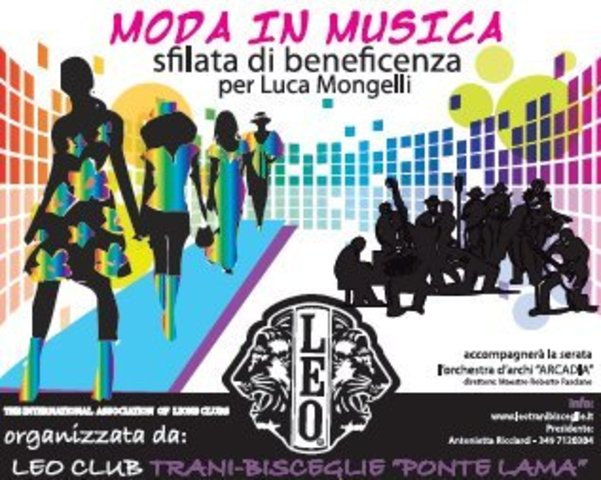 Un'iniziativa per un ragazzino pugliese che anni fa ha subito una vile aggressione che gli ha causato la perdita della vista. E' questa la nobile motivazione che ha motivato il Leo Club Ponte Lama Trani-Bisceglie, patrocinato dai Comuni e dalla Regione. “Trattasi di un’iniziativa fortemente voluta dal nostro club, appena abbiamo conosciuto la storia del piccolo Luca Mongelli, che ci ha lasciato davvero commossi – afferma Antonietta Ricciardi, Presidente del Leo Club Trani Bisceglie “Ponte Lama” – e per il cui caso abbiamo da subito sentito la spinta per fare qualcosa di concreto, affinchè Luca stia meglio in salute nel prossimo futuro. Ideando “Moda in Musica” abbiamo dato anche un contributo ai giovani talenti del nostro territorio e alle piccole, ma grandi realtà aziendali presenti. Il tutto nella comune considerazione che i giovani si muovono per i giovani. Un doveroso ringraziamento sento di darlo alla cara amica, Tina Turturro Mongelli, mamma di Luca, a tutta l’Amministrazione comunale di Trani, ai nostri Lions del club di Trani “Giustina Rocca”, ma soprattutto a Nicole Pansitta, Cinzia Falco e ai nostri soci Leo, senza i quali non avremmo potuto realizzare questo piccolo – grande desiderio solidale”.