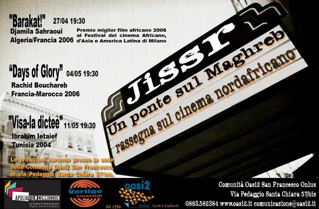 La Comunità Oasi2 San Francesco Onlus, in collaborazione con il Cineclub Vertigo, organizza la rassegna "Jissr: un ponte sul Maghreb. Rassegna sul cinema nordafricano." Gli incontri si terranno presso la sede della Comunità in Via Pedaggio Santa Chiara 57/bis a Trani. L'iniziativa, svolta con il patrocinio dell'Apulia Film Commission, prevede la proiezione di tre film: