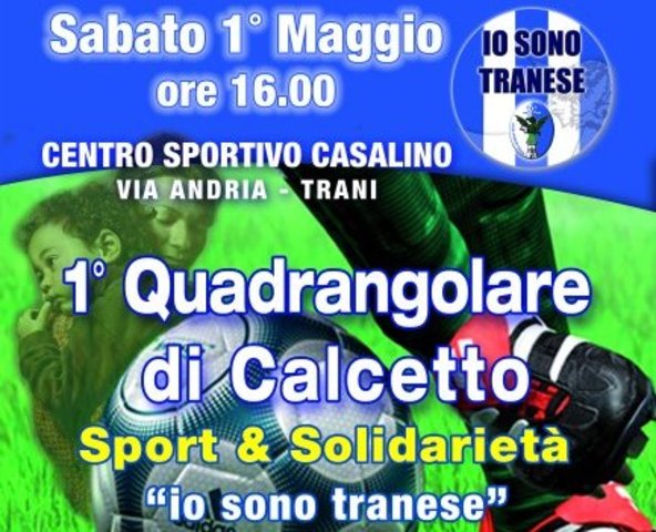Sport e solidarietà a Trani da un’idea del fotografo Sergio Porcelli. Sabato prossimo, 1mo maggio, si terrà la prima edizione del quadrangolare “Io sono tranese”, mini torneo di calcetto con raccolta benefica di fondi in favore della comunità educativa delle “Figlie del Divino zelo”. Quattro le formazioni partecipanti: società della Fortis Trani; giornalisti; tifosi; vecchie glorie. Appuntamento a partire dalle 16 sui campi del “Football sporting center”, in via Andria al chilometro 2.