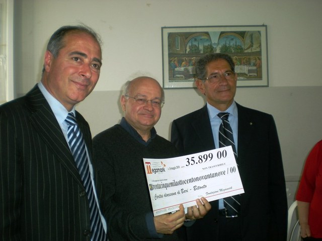 E’ stato consegnato questa mattina alla presenza dell’assessore al commercio e alle attività economiche del Comune di Bari, Franco Albore, presso la mensa di San Giacomo di Bari l’assegno di oltre 35 mila euro da parte di Giovanni Pomarico, presidente della Fondazione Megamark di Trani, al mons. Domenico Ciavarella, vicario generale dell’Arcidiocesi di Bari – Bitonto e a Don Dorino Angelillo, vicario episcopale della Caritas Bari –Bitonto per sostenere le mense per i poveri del territorio del territorio barese.