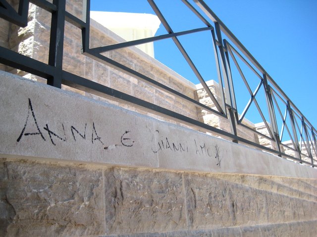 Ma ieri, purtroppo, ci siamo imbattuti nelle prime scritte sulla bianca pietra di Trani, frammiste fra il tenero inconcludente stile Moccia e l’adulazione per improbabili campioni del calcio in maglia rossonera. Ed anche questo luogo è stato, insomma, violato dai grafomani, anche se per il momento in misura molto contenuta.