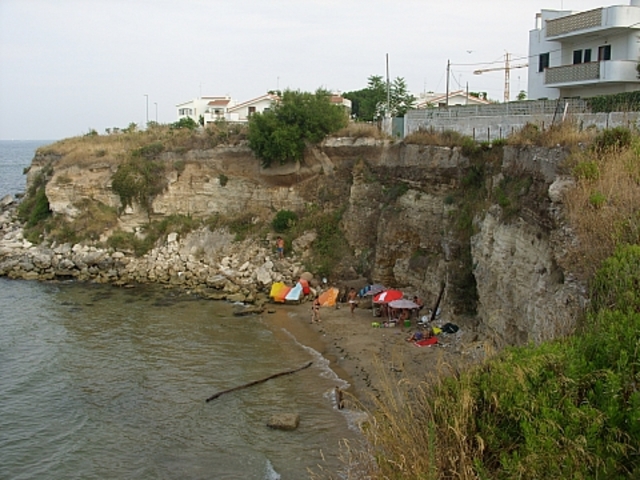 Ma è assai probabile che i bagnanti non fossero a conoscenza della denuncia della nostra concittadina, non essendo sicuramente di origini tranesi, e probabilmente nemmeno del triste fatto di cronaca avvenuto sulle spiage laziali. Infatti in folto gruppo hanno occupato la spiaggetta con ombrelloni, asciugamani e tavolini dove si sono alternate pietanze preparate per l'occasione. È impressionante come si siano posizionati esattamente al di sotto di un tratto di falesia evidentemente oggetto in tempi recenti di crolli, ma le rocce e i detriti dei crolli sono diventati sedie, sgabelli e montagnole da conquistare per la goliardia del gruppo. (a.r.)
