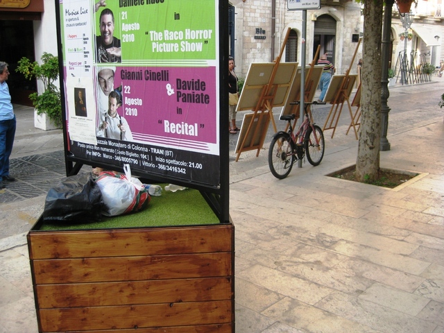 Ma questa volta si è superato ogni limite, perché le buste piene d’immondizia sono state posate sui totem che promuovono le manifestazioni dell’Estate tranese, e persino a due passi dai quadri esposti per la manifestazione “La via del’arte”, anche questa facente parte del cartellone estivo. Dura la protesta degli organizzatori, l’associazione “Arsensum”, addolorato si è detto l’assessore al centro storico, Michele Scagliarini, che ha più volte interpellato sia l’Amiu, sia la Polizia municipale, per rimuovere e prevenire il sempre più allucinante problema.