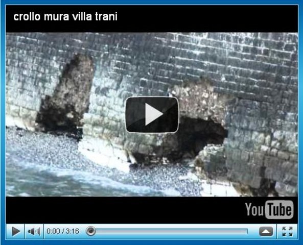 Immagini sufficienti perché ognuno si faccia un’opinione di quello che sta accadendo. E l’amministrazione? L’ultimo annuncio, risalente allo scorso mese di febbraio, è che i crateri nel muraglione «saranno riparati con i fondi provenienti dal programma stralcio di area vasta Bat “Vision 2020”. La città di Trani, infatti, si è assicurata il finanziamento del progetto “Water front” urbano, che ammonta a euro 3.846.687,00. Il progetto presentato affronta le problematiche di staticità della costa centrale, a cominciare dall’erosione del muraglione della villa comunale per finire a quella del Monastero di Colonna. Il finanziamento – spiegava il sindaco - si caratterizza per una velocità di impiego maggiore rispetto ai tradizionali fondi per piani operativi. Infatti, il crono-programma è serrato e ci consentirà di aprire i cantieri entro il 15 giugno».