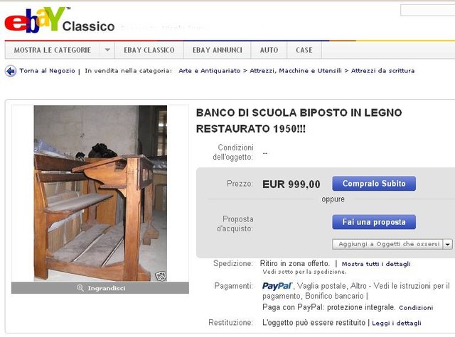 Intanto, però, proprio a Trani, un negozio specializzato nella vendita di oggetti su E-bay propone un banco scolastico biposto in legno del 1950, restaurato (e solo impolverato…), alla “modica” somma di 999 euro.