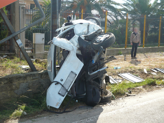 Ieri, alle ore 13,40, un incidente pauroso ha coinvolto due autovetture. Coloro che in quel momento si trovavano a percorrere la pericolosa strada provinciale si sono subito accorti che qualcosa di grave era accaduto. Le nostre immagini allegate, scattate da un nostro aderente che si trovava sul posto, mostrano chiaramente una Renault Twingo di colore bianco, completamente distrutta.