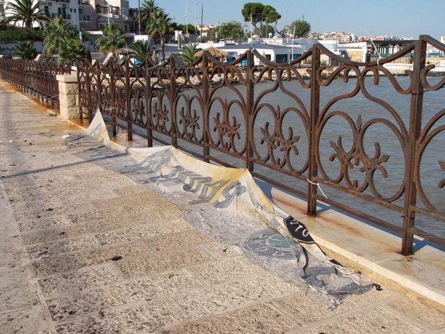 Trani è rimasta un po’ spiazzata e non sapeva che rispondere. Oggi, ad un mese di distanza, forse qualche risposta è capace di darla. Cerca di gridare “sono ancora in piedi” ma vive su equilibri precari e barcolla spesso. Basta percorrere dal basso la strada in salita che conduce al Monastero e guardare il mare. Dopo un mese nessuno ha avuto la forza di togliere uno striscione pubblicitario appeso all’inferriata.