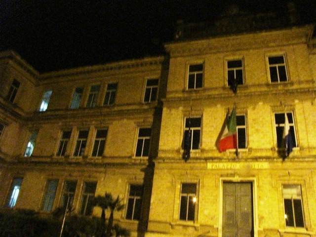 Ieri sera il Comune di Trani invece era parzialmente acceso alle ore 22.27. Nessun gioco di luci originale con tema tricolore, solo la solita luce gialla. I corridoi di un'ala avevano le luci accese ma soprattutto una stanza del secondo piano era illuminata a giorno. Qualcuno forse ha deciso di celebrare M'illumino di meno nel 150esimo anniversario dell'Unità d'Italia lavorando in favore della collettività anche la notte. Uno stakanovista che non avrebbe potuto lavorare al buio, è ovvio. Qualche anno fa Trani partecipò all'evento spegnendo simbolicamente le luci della Cattedrale, l'anno scorso non si registrarono spegnimenti vari ed eventuali. Quest'anno invece, qualcuno al Comune ha lasciato un'ala del palazzo interamente illuminata: forse sperava che il Comune potesse spiccare il volo durante la notte senza creare problemi al traffico aereo, ma con un'ala sola non si arriva molto lontano.