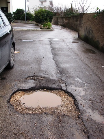 Tre buche che coprono gran parte della strada già di per sé abbastanza stretta. Le macchine che ci passano sono costrette a passarci dentro. Nei giorni di pioggia poi lo stato delle piccole piscine comunali non fa che peggiorare. Il parroco potrebbe prendere spunto e con i ragazzi della parrocchia iniziare attività ludico-ricreative e magari un laboratorio di archeologia proprio in questa strada.