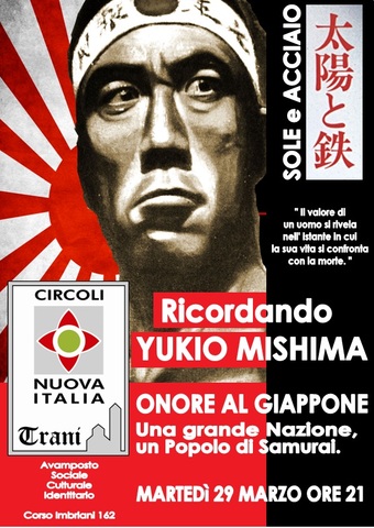 Attraverso il ricordo di Yukio Mishima, vogliamo rendere a nostro modo omaggio al popolo nipponico. L’appuntamento è per martedì 29 marzo alle ore 21 presso la nostra sede in Corso Imbriani 162. Mishima è uno dei pochi autori giapponesi che hanno riscosso immediato successo all'estero. Alberto Moravia lo definì “nazionalista nostalgico, un conservatore decadente”. Uno dei suoi ideali più forti fu il patriottismo, che ha ispirato anche numerosi personaggi delle sue opere, oltre al culto per l'Imperatore, non come personaggio storico o figura autoritaria ma come ideale astratto dell'essenza del Giappone tradizionale.