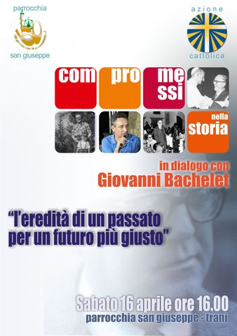 Sabato 16 aprile, alle ore 16.00 nei locali della chiesa di San Giuseppe a Trani sarà presente Giovanni Bachelet per tenere un incontro dal tema "l'eredità di un passato per un futuro più giusto". L'incontro si posiziona in una serie di attività che il gruppo adulti della parrocchia sta seguendo nel percorso "Compromessi nella storia".