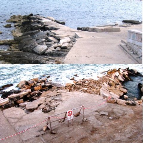 Cedimenti in superficie, ma anche in riva al mare. La nota rilasciata nei giorni scorsi da Puglia delle libertà ha trovato riscontro nella nostra documentazione fotografica. Ecco, a raffronto, infatti, quel tratto di Monastero di Colonna com’era nel 2008 e com’è oggi: una grossa porzione di suolo demaniale non c’è più: opera soltanto dell’erosione del mare? Il tratto ceduto comunque è stato segnalato con transenne.