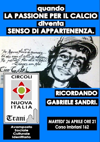 Oggi, martedì 26 aprile, alle ore 21 presso il circolo Pdl Nuova Italia ci sarà un incontro sul tema "Quando la passione per il calcio diventa senso di appartenenza. Ricordando Gabriele Sandri".