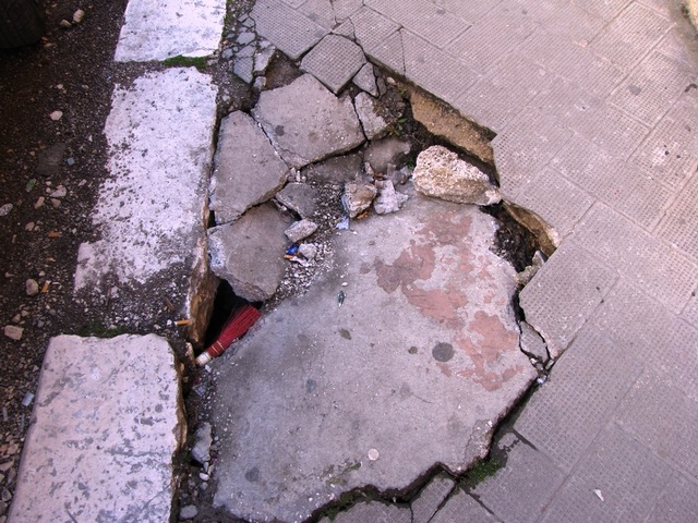 Quando abbiamo poggiato il metro per la misurazione della profondità, abbiamo notato che facendo un po' di forza sarebbe stato possibile andare ancora più a fondo. L'altra situazione preoccupante è questa: osservando in diagonale la buca e guardando sotto il marciapiede, sembra che sia tutto "sospeso" sul vuoto. Sulla continuazione del marciapiede inoltre, si nota una venatura per tutto il suo prolungamento.