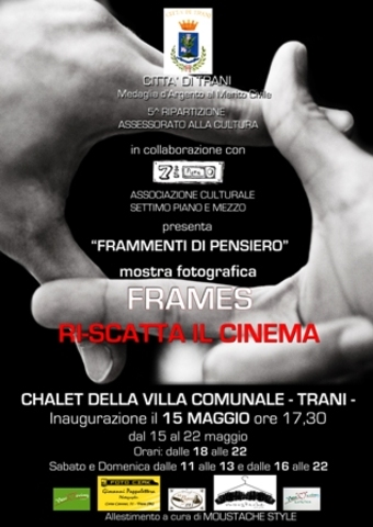 Proseguirà fino a domani, domenica 22 maggio, presso lo chalet della villa comunale, la mostra fotografica “Frames. Ri-scatta il cinema”, organizzata dall’associazione culturale “Settimo piano e mezzo” ed inserita nel progetto “Frammenti di pensiero” dell’assessorato alla cultura. L’esposizione, che presenterà i migliori scatti dell’omonimo concorso fotografico indetto dall’associazione tranese nei mesi scorsi, proseguirà fino al 22 maggio. Ingresso libero. Info: 3490534490.