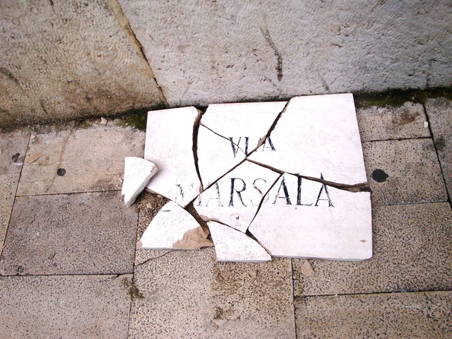 Via Marsala! Avrà pronunciato con tono duro il muro astemio all'angolo di via Bovio. Ciance a parte, la toponomastica tranese è sempre più in difficoltà. Tra strade e piazze a denominarsi e nominate, targhe che non si leggono e oggi targhe che si staccano e si rompono in tanti pezzi.