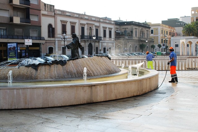 Questa mattina (ieri, ndr) gli agenti del comando di Pm di Trani, coordinati dal Comandante Col. A. Modugno e dal capitano Michele Ruggero, grazie alla preziosa collaborazione della società Amiu, di cui si ringrazia il Presidente, Franco Sotero, hanno effettuato una attività di pulizia straordinaria di Piazza XX Settembre, così come documentato dagli allegati rilievi fotografici.