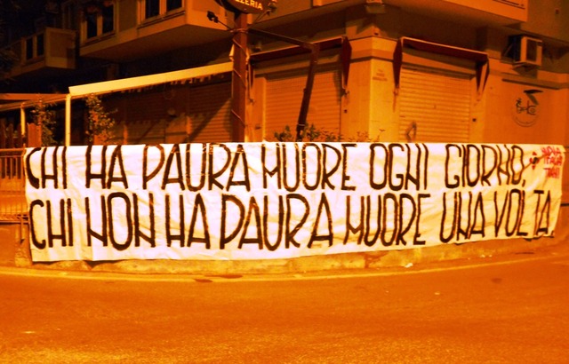 Questa notte, intanto, proprio a Borsellino gli attivisti del circolo hanno dedicato lo striscione collocato alla rotonda che immette sulla via intitolata al magistrato. Nessuno striscione o manifesto, invece, nei pressi della palazzina di piazza Mazzini, sede di uffici di polizia giudiziaria per conto della Procura della Repubblica, anch'essa dedicata a Borsellino.