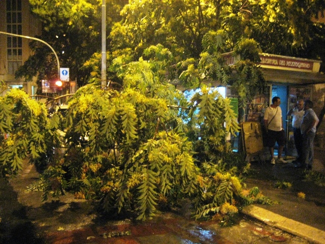 Ma mentre a Pozzo piano s’imprecava, in via Tasselgardo si è rischiata la vita. Un grosso ramo si è staccato da un albero ed è piombato sul chiosco giornali di Felice Marzocca. L’edicolante era proprio sotto la pensilina della sua rivendita, insieme con un amico, ed è stato lievemente colpito dall’arbusto, che ha finito la sua corsa su un’auto parcheggiata lì davanti. Poco prima, appena pochi secondi, all’edicola si era recata una famiglia con due bambini: davvero le conseguenze sarebbero diventate imprevedibili. Sul posto è intervenuta la Polizia locale.