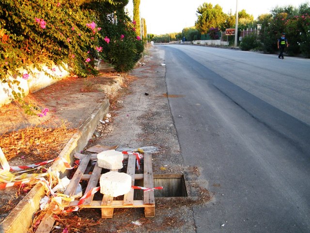 Non saranno certo le coperture in legno utilizzate e adagiate sui pozzetti, che assomigliano molto di più a palliativi improvvisati per prendere tempo, a prevenire il pericolo di incidenti e cadute. Tra l'altro non è presente alcuna segnaletica che preavvisa del pericolo e di conseguenza, rispettando l'obbligo di circolare in prossimità del margine destro della carreggiata previsto dal Codice della Strada, per i conducenti dei veicoli è difficile scansare sia le pedane in legno che ingombrano la strada, sia i pozzetti e sia uno scarico di rifiuti edili posto proprio nella corsia di marcia (a rischio di collisione).