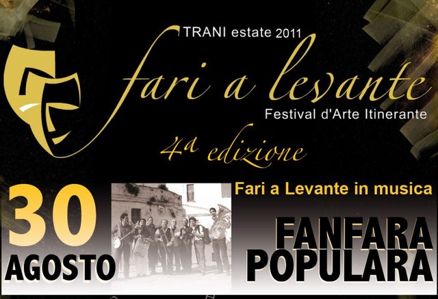 Fari a Levante è il Festival d’arte itinerante della Città di Trani a cura dell’associazione di promozione sociale Fabrica Famae. Evento unico nel suo genere, Fari a Levante intende anche per l’“Estate Tranese 2011” coinvolgere la Città di Trani con una kermesse di spettacoli che andranno in scena durante il mese di agosto. Gli spettacoli in programma per Fari a Levante invaderanno le strade del centro storico trasportando il pubblico in una atmosfera di festa surreale, in un percorso itinerante che toccherà alcune tra le più belle piazze della città, catturando il pubblico in una entusiasmante estate di sano divertimento sia per grandi che per piccini. Il Festival intende proporre un programma vario che spazia dalla musica al teatro, in modo tale da coinvolgere i cittadini e i turisti che vedranno Trani trasformarsi in una elegante vetrina artistica e culturale. L’idea di Fari a Levante è di diventare, anno dopo anno, un appuntamento fisso dell’Estate Tranese, presentando un evento esclusivo di altissima qualità, dando voce e spessore ai talenti e alle professionalità di Trani, agli operatori e agli artisti tranesi che lavorano nel settore dello spettacolo, del turismo e della promozione del territorio. Per creare un programma che esprima il vero animo e le vere potenzialità della nostra città si sono unite, per Fari a Levante, le vere forze tranesi con il compito di far esplodere di energia il centro storico della città e di dare nuovo impulso alla ricca e fremente movida che da sempre contraddistingue la perla del Nord Barese. Fari a Levante è ideato e curato da Claudio Suzzi, direttore artistico e regista di Fabrica Famae Teatro / Spazio O.F.F. di Trani.