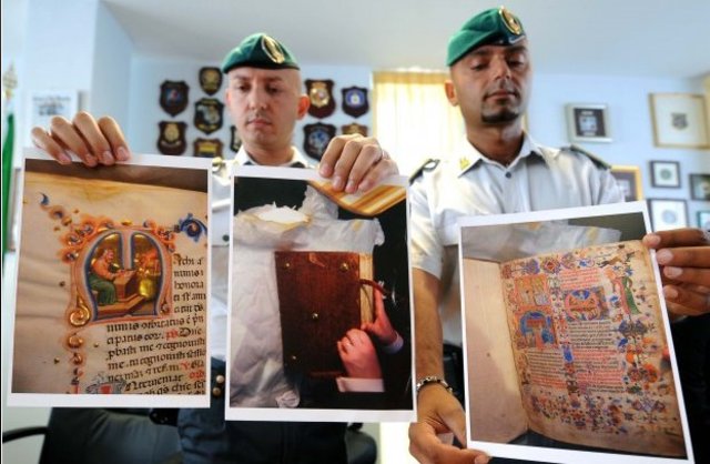 Si tratta di un ''Messale'' del 1370 recante lo stemma della Casata dei Sanseverino di Napoli, sottratto all'Arcidiocesi di Trani; un manoscritto del XV sec.: ''De Maniscalcaria'' o ''Trattato dei cavalli'', sottratto alla Biblioteca Oratoriana dei Gerolamini di Napoli; altro manoscritto del al XV sec.: ''Officium Beatae Verginis Mariae'' o ''Libro delle ore'' sottratto alla Biblioteca Oratoriana dei Gerolamini di Napoli.