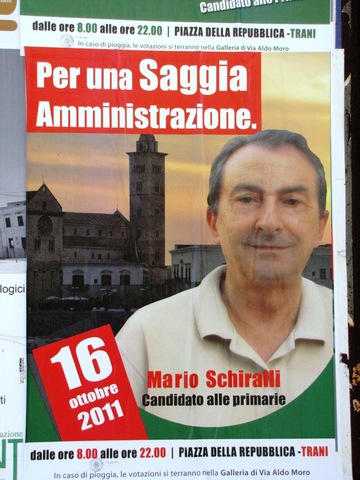 A provocarci questo senso d'angoscia è un manifesto. Quello scelto dall'agenzia di comunicazione (presumiamo) per il candidato dr. Mario Schiralli. Osservate la cattedrale alle spalle del candidato di Federazione della sinistra, non vi sentite privi dei vostri punti di riferimento? Non sappiamo se la scelta sia stata partorita dall'ex direttore della Biblioteca comunale o dall'agenzia, ma sembra tutto fuorché un errore.