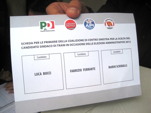 E così a Trani si sono svolte le primarie di una parte della coalizione di centrosinistra. Il PD, La Buona Politica, l’API e la Federazione di Sinistra hanno dimostrato che le primarie sono comunque e in ogni caso una delle fasi preparatorie più sentite e partecipate dagli elettori.