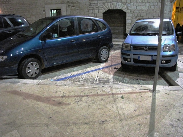 Siamo in piazza Cesare Battisti, nei pressi della cattedrale, anche in questa piazza sono state tracciate le beneamate strisce blu. Sul lato più vicino all'arco di via Arcangelo Prologo, c'è un triangolino di strada vuota tra il marciapiede e la striscia blu. Un nostro concittadino ha ben pensato di ottimizzare gli spazi. Metà auto parcheggiata sul marciapiede, metà sulla strada. E pensate: non ha avuto neanche bisogno del grattino. Insomma, la fantasia al volante proprio non ci manca.
