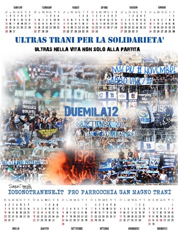 "Ultras nella vita, non solo alla partita". La frase riassume bene il concetto dell'essere ultras: non solo sostenere la squadra della propria città ma anche spendersi per il prossimo. I tifosi tranesi sono così diventati i protagonisti di un calendario che li ritrae in alcune coreografie inscenate nel corso di questo campionato ed immortalate dal fotografo Sergio Porcelli. Tra gli scatti scelti, si evidenzia lo striscione esposto per ricordare la scomparsa dei tifosi Rino e Filippo, o anche quello che celebra il 23° compleanno degli Irascibili.Naturalmente anche gli altri tre gruppi del tifo organizzato, ovvero Gba, Trani '29 ed Nst, sono messi in evidenza nel calendario 2012. Il ricavato (ogni copia avrà il prezzo di 10 euro) della vendita, che avverrà in numerosi punti della città e in particolare nelle sedi dei club ultras, andrà in beneficienza alla parrocchia di San Magno per contribuire alla costruzione del "Tempio parrocchiale". Un'iniziativa che non ha potuto che trovare la soddisfazione di Don Dino Cimadono, parroco della neonata parrocchia:" E' un'idea molto lodevole- ha affermato il parroco-. Spingiamo ogni cittadino a contribuire per un fine nobile, ovvero quello di togliere i ragazzi dalle strade ridando alla parrocchia il ruolo di comunità. Vogliamo aiutare i giovani a vivere nella sequela di Cristo in una vita all'insegna dell'amicizia e della fratellanza". Il parroco ringrazia naturalmente il mondo dei tifosi e Sergio Porcelli per l'iniziativa:"Spero che ci sia sempre più collaborazione tra parrocchia e ambienti sportivi". Infatti, questa è solo la prima di una serie di progetti di beneficienza che vedranno coinvolti il fotografo Porcelli, la parrocchia e lo sport tranese. La Parrocchia di San Magno è intanto pronta per un altro evento. Entro lunedì 12 dicembre, infatti, verrà eretta una tendostruttura della grandezza di 140 metri quadri che sorgerà sul terreno della comunità grazie alle donazioni dei parrochiani. La tendostrutturà ospiterà incontri, attività di catechesi ed altro. Nella giornata dell'inaugurazione,ovverrò lunedì 12, i fedeli si stringeranno attorno a un falò e, tra musica e frittelle, passeranno una serata in allegria.