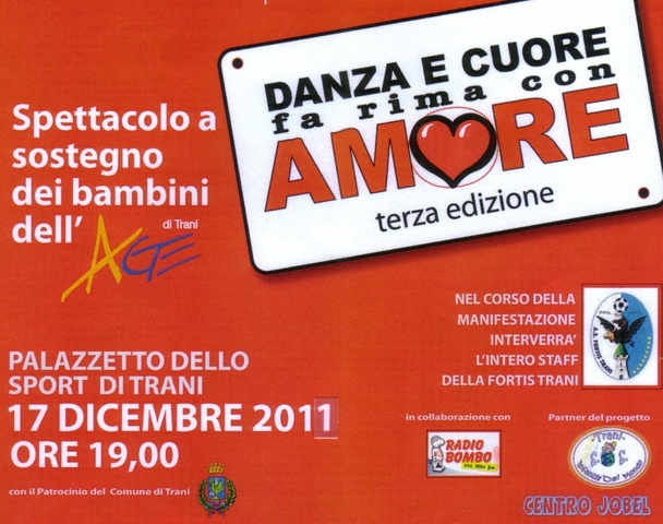 «Danza e cuore fa rima con amore». Questo il tiolo della terza edizione dello spettacolo benefico, a sostegno dei bambini dell’Associazione genitori di Trani, che si terrà sabato prossimo, 17 dicembre, alle 19 al PalaAssi. Iniziativa a cura dell’Age, con il patrocinio del Comune, la collaborazione del centro “Jobel” e la partecipazione di numerose scuole di ballo. Nel corso della manifestazione interverranno dirigenti, tecnici e calciatori della Fortis Trani. Ingresso con offerta.