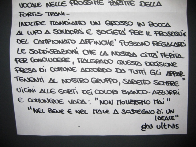 "In seguito ad una riunione interna, dopo quanto accaduto domenica 22/01 nella trasferta di Francavilla in Sinni, noi gruppo gruppo GBA Ultras ci autosospendiamo per un periodo di tempo non ancora stabilito, dall'esporre il nostro stendardo sia nelle gare casalinghe, sia nelle gare di trasferta, facendo mancare così il nostro apporto vocale nelle prossime partie della Fortis Trani. Inoltre mandiamo un grosso "in bocca al lupo" a squadra e società per il prosieguo del campionato affinché possano regalarci le soddisfazioni che la nostra Città merita. Per concludere, malgrado questa decisione presa di comune accordo da tutti gli appartenenti al nostro gruppo, saremo sempre vicini alle sorti dei colori biancoazzurri e comunque vada: non molleremo mai. Nel bene e nel male a sostegno di un ideale".