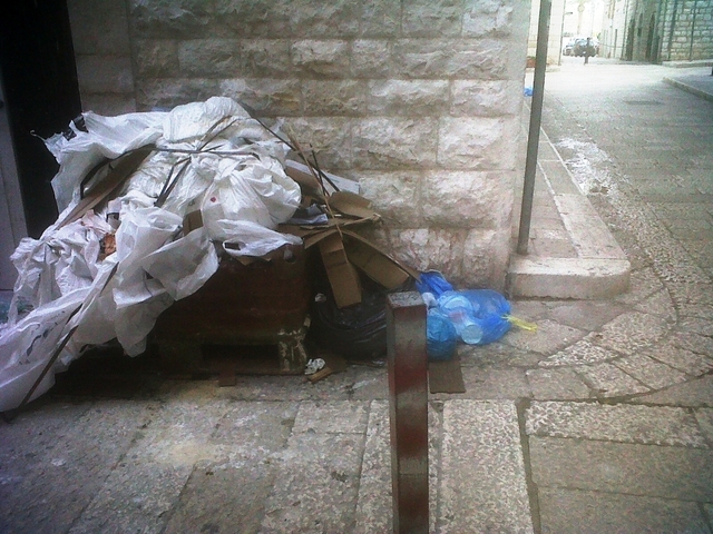 Sempre il nostro utente, in un’altra foto, pone in risalto lo stato dei luoghi, a causa di altri lavori edili, in via Bellini: qui i rifiuti sono stati lasciati all’aperto con rischio determinando una situazione di degrado e rischio per i bambini.