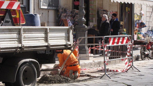 A pochissime ore dalla nostra segnalazione, gli operai sono già al lavoro per la riparazione urgente del tombino situato in via Mario Pagano fra l’edicola e l’orologiaio ubicati nei pressi della chiesa di San Rocco. La struttura stava progressivamente cedendo e vi era il rischio concreto che il peso dei veicoli la facesse sprofondare e che, in ogni caso, i cittadini potessero inavvertitamente mettervi il piede in fallo. Il problema era stato segnalato più volte alle autorità comunali, l’ultima con una telefonata fatta alla Polizia locale da un cittadino proprio mentre realizzavamo le riprese video che accompagnano la notizia e documentano lo stato dei luoghi prima della messa in sicurezza.