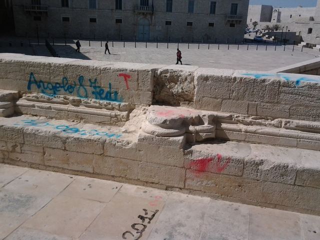 Dopo l'amore da discount dalle lettere dorate, ecco un altro scempio. Non sappiamo quando sia stato fatto tutto questo ma dinanzi al portale del nostro Duomo, ecco nomi e date stampate con spray rosso ed azzurro.