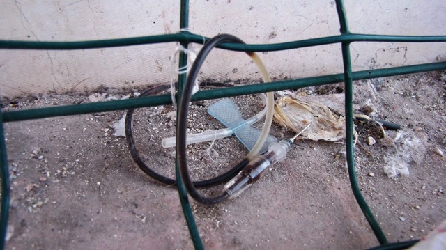 Attorcigliati alla rete metallica di delimitazione del campetto da basket vi sono un deflussore con ago e la parte finale di una flebo per terapia endovena.