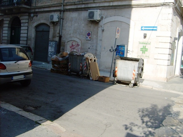 Nella foto a lato potrete osservare un posto parcheggio riservato a disabili in via Sasso (nei pressi di piazza Garibaldi) occupato interamente da bidoni della spazzatura.
