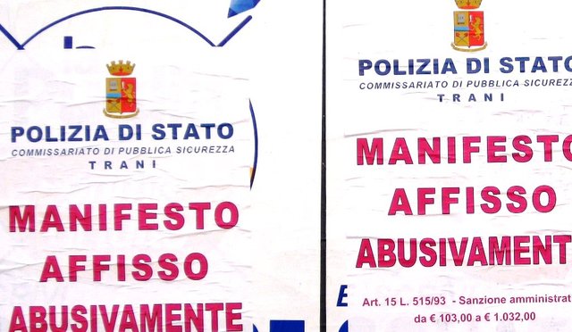 Da venerdì scorso, come è noto, la Polizia di Stato e la Polizia locale stanno oscurando le affissioni elettorali abusive. Infatti, proprio a partire dallo scorso 6 aprile, è iniziato formalmente il divieto di: svolgere: propaganda elettorale luminosa a carattere fisso, ivi compresi i tabelloni, gli striscioni o i drappi; effettuare ogni forma di propaganda luminosa mobile; compiere lancio o getto di volantini; utilizzare altoparlanti su mezzi mobili fuori dei casi previsti dall’articolo 7, secondo comma, della legge 24 aprile 1975, n. 130 (possibilità di preannunciare il giorno e l’ora in cui si terranno comizi e riunioni di propaganda elettorale).