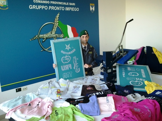 Nel medesimo contesto sono stati effettuati altri controlli a Modugno, Andria e Trani, nei confronti di commercianti intenti nella vendita di capi d'abbigliamento contraffatti, individuando tre stamperie ubicate ad Andria, Trani e Rimini.
