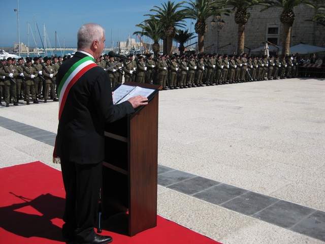 La delibera del consiglio comunale risale al 4 luglio dello scorso anno, il conferimento formale è avvenuto questa mattina. Ci riferiamo alla cittadinanza onoraria in favore del Nono reggimento fanteria “Bari”, di stanza presso la caserma “Lolli Ghetti”, gloriosa istituzione che, proprio perché storicamente e fortemente radicata in città, ne ha meritato il massimo riconoscimento di appartenenza e fratellanza, così come già era accaduto il 25 gennaio del 2011 in favore dell’arcivescovo, Mons, Giovan Battista Pichierri.