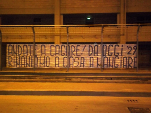 Questo gruppo di gente che vive a scrocco (ipse dixit), decise a settembre di totale accordo di dar fiducia a questa società pagando 80 euro di abbonamento, nonostante le vicissitudini di un passato non proprio idilliaco (e alcuni senza, rimarchiamo, aver ricevuto la maglietta biancazzurra promessa con la sottoscrizione della tessera). Il resto dei nostri ragazzi impossibilitati a fare l’abbonamento ha, con grandi sacrifici soprattutto nei weekend, pagato ogni domenica il biglietto rinunciando ad una pizza il sabato sera solo per passione. Noi non conosciamo il significato dei termini “accredito”, “ingresso di favore”. Per questo ci possiamo prendere il lusso di scrivere ciò che vogliamo, di contestare quando vogliamo. NOI NON CONOSCIAMO MERI DOPPI FINI.