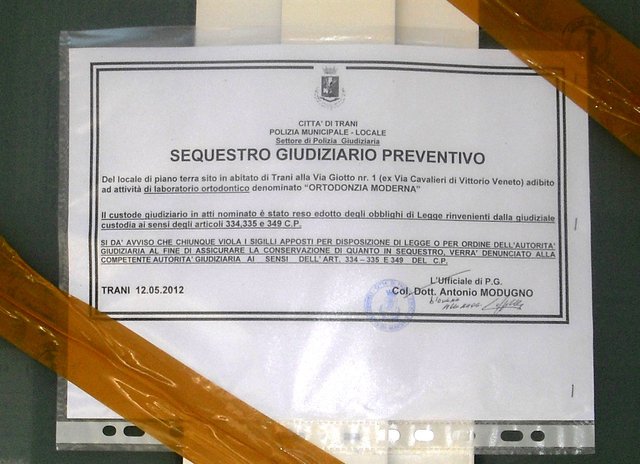 La Polizia locale di Trani ha posto sotto sequestro il laboratorio odontotecnico “Ortodonzia moderna”, sito in via Giotto nei pressi di piazza Dante. Il provvedimento è stato disposto dal Gip, Roberto Olivieri del Castillo, su richiesta del sostituto procuratore della Repubblica presso il tribunale di Trani, Giuseppe Maralfa. Ad eseguire la misura cautelare, gli agenti del settore annona del corpo, coordinati dal comandante, Antonio Modugno, e dal maggiore Elsa Coppola.