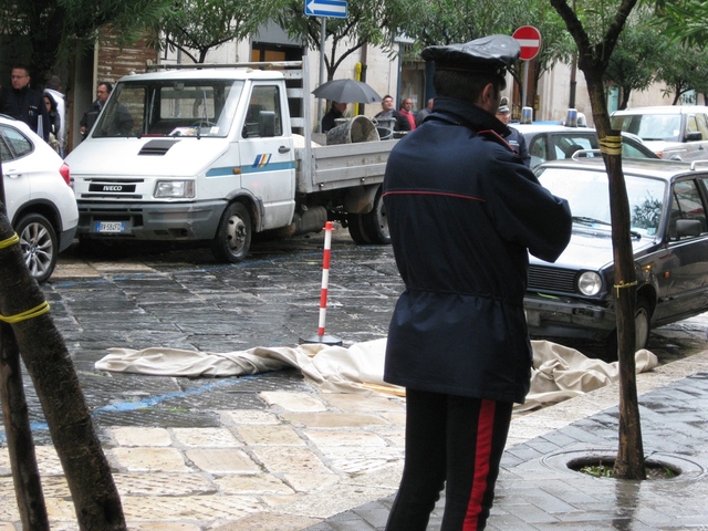 Un uomo, un noto commerciante locale di 64 anni, C.M. le sue iniziali, è precipitato dal balcone del palazzo dell'Acquedotto in via Cavour, finendo dapprima su un'auto parcheggiata e poi sul basolato sottostante a pochi metri dai tavolini del bar. Sul posto sono intervenuti prontamente gli operatori del 118, che non hanno potuto salvarlo, in seguito i Carabinieri e, infine, il magistrato di turno che ha disposto, solo dopo la sua ricognizione del luogo, la rimozione del corpo dal luogo dell'impatto.