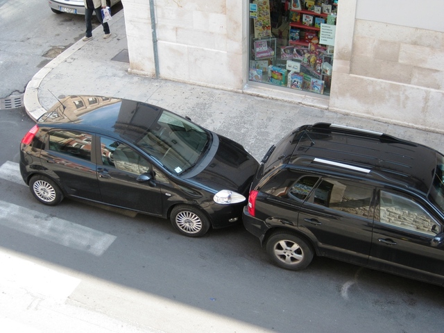 Questa, in un colpo solo, commette una doppia infrazione: “tampona” letteralmente un’altra auto parcheggiata, azzerando totalmente la distanza minima di sicurezza (d’obbligo anche da fermi); parcheggia sulle strisce impedendo l’agevole attraversamento pedonale della strada. Il proprietario dell’auto che precede ha chiamato la Polizia locale, ma il proprietario dell’auto in doppio difetto è stato più veloce degli agenti e l’ha fatta franca. Teatro del siparietto, via Lambertini.